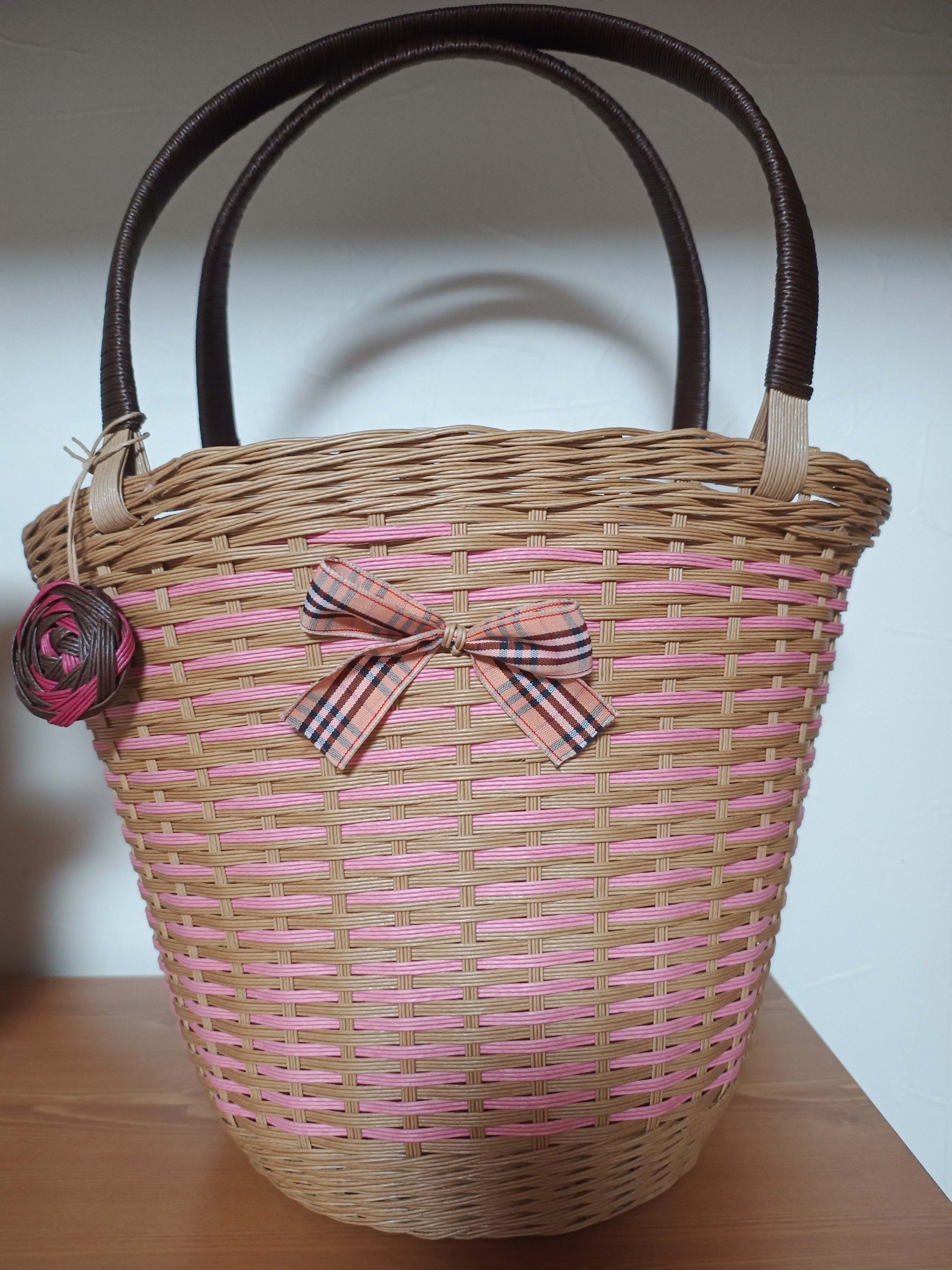 昨日のランチでご一緒のTさん。ご自身の創作された『籠』を、茶房ギャラリー夢さんに出店されております。そもそも、お店で、働いていた時期があったそうで、真琴さんやお母さま、お客様達とお顔馴染みさんでした。リメイクして戻って来た可愛いわたしの『籠』、ご覧ください~😍持ち手が可動式に、そして色は茶色に🩷チャームとリボンをあしらえてくださりました😊Tさんありがとう🙏