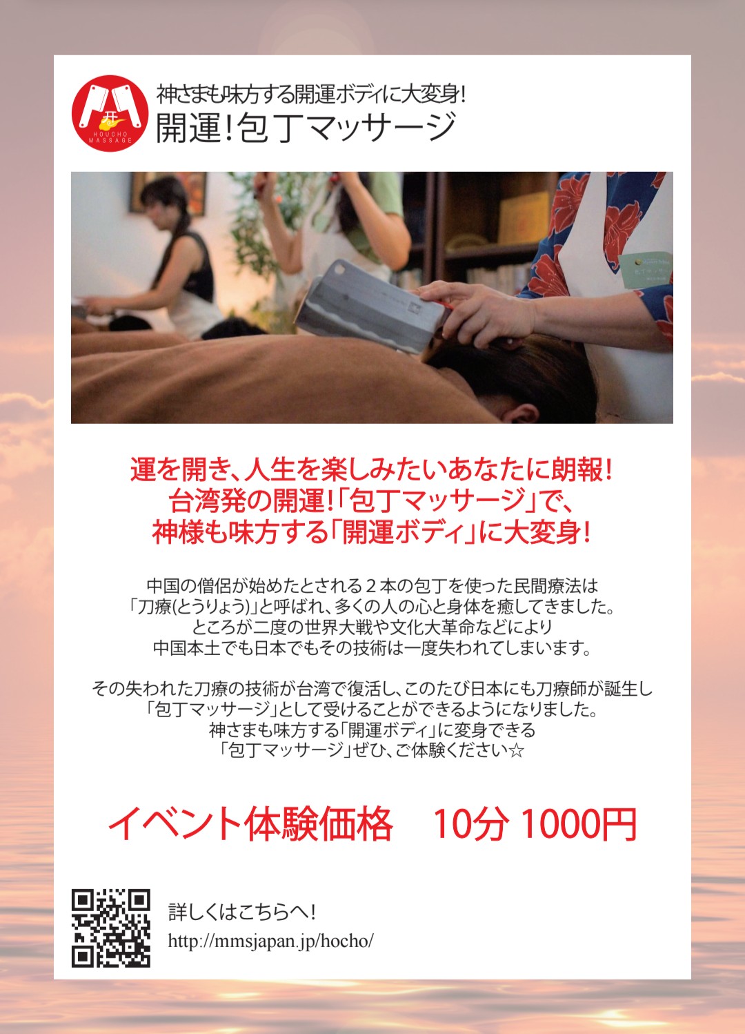 メディアやイベントでも注目を集める「包丁マッサージ」は、2本の刃のない包丁でリズミカルに体を振動させる、新感覚のマッサージ。